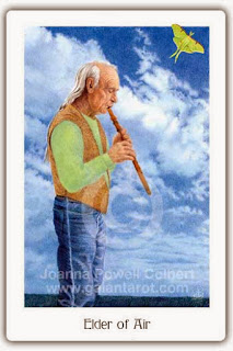 | «Elder of Air – Старейшина Воздуха» в Чакровом раскладе Я очень люблю делать Чакровый расклад (тот самый из 7 карт - по одной на каждую чакру). Его просят сделать довольно часто. И хотя он совсем не простой, и на него уходит много времени, я всегда с большим интересом работаю с эти раскладом.Мне интересно наблюдать как карты высвечивают не просто физическое и энергетическое состояние организма, а показывают эмоциональное состояние человека, проблемы его жизни. Этот расклад я делаю на изумительной колоде «Gaian tarot» - Таро Гайи. На этой колоде я смотрю вопросы, связанные со здоровьем, беременностью и – чакровый расклад. Мои кверентки в основном – женщины. Эта колода удивительно заточена на просмотр именно женщин – их здоровья, самочувствия, проблем, радостей и огорчений. Огромная теплота исходит от каждой карты. Но это не значит, что в колоде изображены только женщины. Мужских образов в ней достаточно, и об одном из таких образов мне хочется сказать особо. Это «Elder of Air – Старейшина Воздуха» (Король мечей). На карте изображен пожилой мужчина, играющий на свирели. Он погружен в свою игру. От него к небесам улетает бабочка. Уже несколько раз этот аркан выходил в чакровом раскладе, показывая работу одной из чакр. И каждый раз он показывал нарушения в работе чакры. Здоровье органов, за которые отвечает данная чакра, было в порядке, проблем больших не наблюдалось. Но был дисбаланс в движении энергии через чакру, на которую выпала карта. Семь чакр человека – это энергетические центры, через которые – от одного к другому – проходит энергия: от нижней чакры к верхней и - обратно. Т.е. каждая чакра, кроме того, что она вырабатывает энергию, настроена так же на прием и передачу энергии других чакр. Данный аркан - Старейшина Воздуха - говорит о том, что чакра, вырабатывая достаточно энергии для поддержания органов, которые контролирует, тем не менее, отправляет «вверх» - ограниченное количество энергии, и довольно много энергии отправляет «вниз». Что это за энергия, откуда она – об этом говорят, обычно, другие карты расклада, показывающие работу остальных чакр. Варианты могут быть следующие: *или чакра не получает достаточно энергии от предыдущей нижней чакры, и, следовательно не может отправить вверх много, *или – проблема в ней самой: она вырабатывает энергии не достоточно: ее хватает для поддержания «своих» органов, но отправить нужное количество «вверх», она не может, *или – верхняя чакра отдает ей слишком много энергии, *или – эта чакра настроена на отправление энергии «вниз», а «вверх» почти ничего не отправляет – т.е. идет нарушение ее работы. Какой бы вариант значения ни был, эта карта всегда сигнал о том, что поток энергии в организме нарушен. И даже если на самочувствии это пока не сказалось, этот сигнал – повод понаблюдать за собой, своим самочувствием, подумать о причинах такого нарушения в энергетическом потоке. И конечно, всегда полезно обратиться к врачу и проконсультироваться с целью предупреждения или профилактики тех или иных заболеваний. Если же анализировать проблемы в жизни кверента, на которые может указывать Старейшина Воздуха в чакровом раскладе, то в зависимости от позиции в раскладе (чакра) речь может идти об одиночестве, замкнутости, сдержанности, закрытости человека, недостатке общения как простого, так и дружеского, любовного. В 