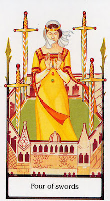 | Магия и символы «Tarot of The Old Path»: 4 мечей Четверка мечей, традиционно - это аркан торможения, остановки, бездействия, отсутствия активности, восстановления и излечения от болезни, одиночества. В колоде «Tarot of The Old Path» - «Таро Старого Пути» она имеет некоторые свои нюансы.