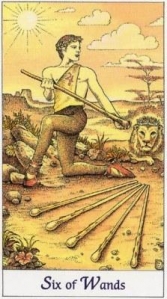 Эта карта подобна поздравительной открытке в раскладе. Она так и говорит «С днем победы!» По традиции, карта символизирует благоприятный исход любого дела, его доведение до победного конца, триумф воли и мужества. Ее появление в раскладе возвещает, что начинается полоса удач, и судьба благоволит вопрошающему, а то, на что он надеется, скоро пройзойдет. Надежды сбудутся, желания исполнятся, дары будут получены. Она говорит: ты уверенно доберешься до победного конца, преодолеешь трудности, не теряй оптимистического настроения. Это карта завоеваний и побед, радужных перспектив, жизненного успеха, прогресса, усилий, приносящих награду (логически она следует за полной борьбы Пятеркой и предшествует охране своих завоеваний по Семерке). Если другие карты в раскладе намекают на какую-то борьбу, то Шестерка Жезлов говорит, что битва увенчается окрыляющим успехом. Вообще она, как правило, выпадает после какого-то тяжелого жизненного испытания, периода упорного труда, давая повод для радости. Даже если это не так, в любом случае, ее появление говорит о том, что данный период очень благоприятен для начинаний, будь то создание семьи или дела карьеры. Успех в любой избранной сфере деятельности обеспечен! В ведении Шестерки Жезлов находятся также всевозможные важные и радостные вести. По этой карте идут успешные деловые поездки. Как результирующая карта расклада, Шестерка Жезлов говорит о том, что все предыдущие влияния нужны для того, чтобы человек стал более зрелым, сильным и смелым для продвижения по своему пути, преодолев трудности, сопротивление и конфликты. Как заметил один современный таролог, Шестерка Жезлов – это не «гнилой компромисс», а именно победа после борьбы и заслуженная (хотя иногда и как бы «незаслуженная») награда. Эту карту не назовешь интимной, в ней всегда есть элемент помпы и парада - обнародование успеха, провозглашение его для других. http://www.taro.lv/ru/78_dverej/door_42