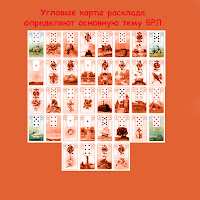 | Часть 2. Угловые и финальные карты В Большом Раскладе Ленорман каждая карта образует огромное число комбинаций с другими картами, но начинать трактовку лучше всего с 4х угловых карт. Это карты 1, 8, 25 и 32 (они выделены на рисунке, а если вам плохо видно - изображение можно просто увеличить одним кликом). Они указывают на основную тему расклада. Кстати, первая карта расклада, та что лежит на месте Всадника обычно задает тон всему раскладу, а также показывает на мысли кверента. К примеру, что наиболее важно для него или нее в данный момент. Традиционно ее рассматривают в паре с картой в позиции 32, а карту в позиции 8 в паре с 25-той. Позднее, следует связать значение карт в одно толкование. Кстати, с первой картой связаны некоторые гадальные «приметы». Бытует мнение, что если карта Крест — становится в БРЛ на первое место, то в этот день расклад делать нельзя. Так же поступают и в том случае, если первой картой расклада оказывается Книга, что указывает на закрытость информации, желание сохранить секрет. Лично я так не считаю, в одной из моих колод Книга изображена открытой — почему бы не прочитать ее? Но, повторюсь, это лично дело каждого. Также считается, что первые четыре карты расклада - 1, 2, 3, 4 показывают настоящее или ситуацию ближайших нескольких дней. Последние 4 карты - 33, 34, 35, 36— гарантированное будущее, которое произойдет в течении 4-6 недель. Стоит рассмотреть вначале сочетание карт 34-35, потом карт 35-36, а в конце соединить все в одно. Конечно, при выкладке расклада можно заранее оговорить нужный нам промежуток, к примеру, можно сделать расклад на 6 месяцев, но сами временные промежутки зачастую определить тяжело, а вот последние 4 в в этом плане истолковать легко - события произойдут не позднее 6 недель. После этого мы смотрим на 4 карты в центре расклада — см рисунок. Это карты в позициях: 12, 13, 20 и 21. Один из подходов трактовки, рассматривать 4 карты как послание года. Что будет основным в этом году вашей жизни? Интерпретацию следует проводить следующим образом: 12 карту интерпретируют в паре с 21, а 13 с 20. Можно также соединить все 4 карты и постараться проинтерпретировать их вместе. Второй подход рассматривает эти карты как то, «что на сердце». В любом случае, их интерпретация безусловно важна. My WebPage