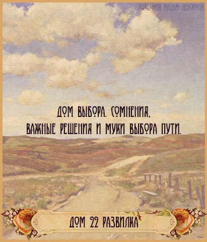 Также 21 Дом Горы говорит о том, что касается жизни за грани цей или же за чертой города, но обычно это большие расстояния с серьезными кордонами. По 21 дому можно посмотреть есть ли у человека желание жить за границей, перспективы переезда и какие проблемы могут возникнуть при попытке переехать на постоянное место жительство или работу в другую страну.22 — Дом Развилки в Большом раскладе Ленорман:Дом выбора. Дом Развилки в Большом раскладе ЛенорманДом выбора, кризиса и раздвоенности. Человек стоит перед выбором, а с чем он связан Вы увидите по той карте, которая туда упадет. Если в 22 дом попала карта Сердце, то выбор касается любовной сферы, если карта Кольцо, то обязательств.Дом Развилки — это период и муки выбора, трудности, которые возникают при принятии решения. Дом говорит о выборе того или иного пути, о выборе партнёра одного из нескольких. Или же сам Вопрошающий может стать объектом чьего-то выбора.- В положительном ключе Дом Развилки показывает возможности, разные варианты и пути направления, альтернативу.