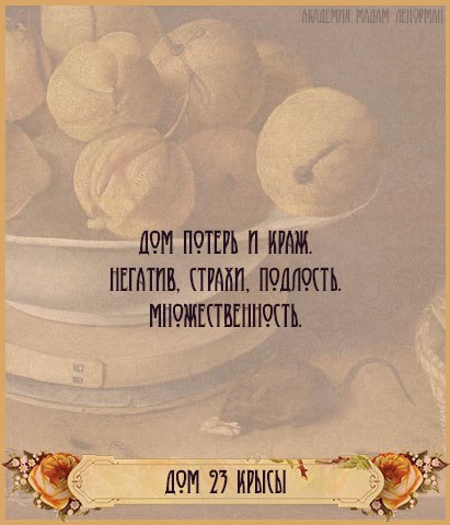 Также Дом Развилки – это отделения и расхождение в разные стороны. Не очень хороший признак, если сюда попадает карта-бланка Вашего партнера.23 — Дом Крысы в Большом раскладе Ленорман:Дом потерь. Краж. Мелких неприятностей. Дом Крысы в Большом раскладе ЛенорманДом Крысы – дом убытков, хаоса, разрухи, потерь и страхов (что-то грызет и гложет). По этому дому идет крах, физический или моральный вред, ущерб, кража, болезнь, беспокойство, страхи, мелкие неприятности, злыдни в Вашем окружении, которые медленно, но верно подтачивают Ваше основание, например, мелкие пакости со стороны соседей, или небольшие жалобы от коллеги на Вас начальству. Поэтому 23 дом может говорить о крысиных гонках на выживание, Вас пытаются выжить и подсидеть.Какая карта попадет в дом Крыс, в той сфере и стоит ждать потери.Также Дом Крысы указывает на нечистоплотность, на то, что идут процессы за Вашей спиной, потому, при соответствующем вопросе и выпавших катах может указывать на неверность партнера. Также по этому дому идет жадность, патологическая экономия, стремление накапливать вещи нужные и ненужные.Дом Крысы – это и дом хлопот и суеты. Кверент в этом доме может все время суетиться по пустякам, которые ни к чему хорошему не приводят, мышиная возня.+В положительном аспекте Дом крысы – это плодовитость и способность к кропотливой работе (вгрызание в суть, прогрызание).24 — Дом Сердца в Большом раскладе Ленорман:Дом любви. Дом Сердца в Большом раскладе ЛенорманДом любви. Сердечная атмосфера, дела сердечные, близкие отношения и близкие люди, «чем сердце успокоится».24 дом Сердца очень важен в любом раскладе, т.к. любовь – это самое главное в жизни любого человека, база и смысл жизни. По этому дому смотрят как текущее состояние дел на любовном фронте, так и склонности человека к влюбчивости, его постоянство в этом чувстве, а также разочарования прошлых или несостоявшихся романтичных отношений, «травмы» на сердце.Любовь может как вдохновлять человека на свершения, так и доводить до сумасшествия и нервного расстройства. А может и такое быть, что у человека эта зона атрофировалась, она фрустрирована и пока он не способен никого любить.Если вопрос был задан о здоровье, то тогда Дом Сердца не менее важен, т.к. в медицине он обозначает сердечно-сосудистую систему.