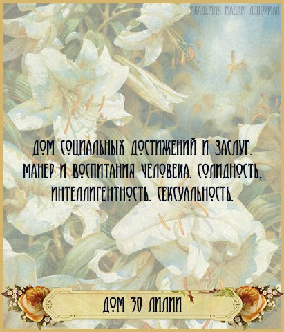 | 25 — Дом Кольца в Большом раскладе Ленорман:Дом сотрудничества, партнёрства, соглашений и обязательств. Дом Кольца в Большом раскладе ЛенорманДом соглашений и союзничества. В этом доме, все что связано с официальными отношениями – браки, разводы, договора, брачные контракты, партнерства всех видов связи, соединения, а также гражданские и гостевые браки.Также по этому дому идут обязательства (связанные одной цепью) - если в доме Креста по судьбе, в доме Собаки из чувства долга и по совести, то в доме Кольца обязательства по закону, то что связывает и сковывает. В 25 доме лежит все то, на что мы согласились, какие обязательства на себя взяли, какие союзы и партнерские соглашения заключили.В благоприятном положении это дом брака, отношений и гармоничного партнерства.При негативном раскладе дом Кольца может указывать на повторяющиеся сценарии в жизни человека, т.к. само Кольцо является символом зацикленности и бега по кругу.26 — Дом Книги в Большом раскладе Ленорман:Дом знаний. Тайн. Обучения. Дом Книги в Большом раскладе ЛенорманДом учений, знаний, тайн и оккультизма. В Доме Книги все, что связано со знаниями и обучением, образованием и учебой, школой, а также какие-то неизвестные факторы, т.к. Книга все-таки по большей части изображена закрытой.Этот дом актуален для всех обучающихся, как в школе, так и в ВУЗе, при подготовке материалов для конференций и выступлений. Может говорить об онлайн обучении или об Интернете. Дом Книги покажет насколько человек стремится к самообразованию, к получению новых знаний, есть ли интерес к развитию, познаванию нового, чтению книг. Связан ли человек с интеллектуальной деятельностью – студент, преподаватель, ученый -исследователь и т.п.Также 26 Дом Книги – неафишируемая информация, надо потрудиться чтобы ее найти, скрытая или личная история. Что-то скрывает либо сам Кверент, либо от него что-то скрывают.27 — Дом Письма в Большом раскладе Ленорман:Дом сообщений и бумаг. Дом Письма в Большом раскладе ЛенорманДом писем, сообщений, бумаг и документов, корреспонденции и общения по переписке. В этом доме сдержится все, что связано с поверхностной информацией, сообщениями, факсами, емейлами, известиями, рекламой, оповещениями, рассылкой, спамом. Также это дом оформления документов, заполнения бланков и умения письменно излагать свои мысли, поэтому если Кверент пишет статьи или книги, то этот дом для него важен.28 — Дом Мужчины в Большом раскладе Ленорман:Дом Кверента или важного мужчины в жизни Кверентки. Дом Мужчины в Большом раскладе ЛенорманЭто дом Кверента, если он мужчина или же партнера Кверента, если это женщина. В таком случае это будет дом партнерства как такового, даже если сейчас никакого мужчины в жизни женщины нет, тут либо наличие партнера, либо перспективы на отношения.Для Кверента мужчины – описывает его характеристики, самооценку и качества.29 — Дом Женщины в Большом Раскладе Ленорман:Дом Кверентки или важной женщины в жизни Кверента. Дом Женщины в Большом Раскладе ЛенорманЭто дом Кверента-женщины или же партнера Кверента, если клиент мужчина. В таком случае это будет дом партнерства как такового, даже если сейчас никакой женщины в жизни мужчины нет, тут либо наличие партнера, либо перспективы на отношения.Для Кверента женщины 29 Дом описывает ее характеристики, самооценку и качества.30 — Дом Ли