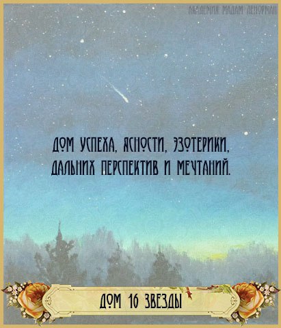 | 13 — Дом ребёнка в Большом раскладе Ленорман:Дом родительских отношений. Начинаний. Уменьшения. Дом ребёнка в Большом раскладе ЛенорманДом Ребенка – Дом нового начала и детей, говорит о всем маленьком, небольшом и новом: новые начинания, беременность, желание родить ребенка, маленький подарок – все это может идти по 13 Дому. Также вопросы опекунства, ответственности за вверенных людей, не обязательно детей, отношения в рамках родитель - ребенок, начальник - подчинённые. Также этот дом указывает на нечто новое, стартап, то, чего раньше не было в жизни.Если туда попадает негативная карта, например Кнут и Метла, то может указывать на конфликт в школе и проблемы у ребенка.14 — Дом лисы в Большом раскладе Ленорман:Дом хитрости. Обмана. Лести. Труда. Дом лисы в Большом раскладе ЛенорманДом Лисы - Дом хитрости и неоплачиваемого труда, ложных целей, детального планирования, недоверия и осторожности. Дом Лисы указывает как на ложь, таинственность, скрытность, изворотливость, умение льстить и обманывать.Но также и на карьеризм, проявление профессиональных качеств, ловкость и изворотливость ума. Готовность человека пуститься в авантюру. Как ни странно, но карта Лиса и ее Дом часто говорят о работе и рабочей обстановке, особенно если работа по найму, от случая к случаю, может показать работу на даче. Но в таком контексте дом Лисы рассматривается при вопросах о работе, традиционно это дом лукавства, все, что падает в этот дом, попадает в лапы Лисы Алисы и Кота Базилио.15 — Дом Медведя в Большом раскладе Ленорман:Дом силы. Опеки. Дом Медведя в Большом раскладе ЛенорманДом силы и власти, помощи, благородства и покровительства, а также второго мужчины. Как дом силы показывает прежде всего то, насколько человек может давить на окружение, насколько он сам тяжёлый человек как руководитель или отец семейства, или может ли сам поддаваться давлению со стороны руководства или родственников.Также дом Медведя говорит о «пробуждении из спячки», проявление активности, показывает в чем сила Кверента, активные действия. Как дом второго мужчины является указанием на любовника, ухажер, бывшего мужа.Это дом второго по важности мужчины для Кверентки.16 — Дом Звёзд в Большом раскладе Ленорман:Дом успеха. Дом Звёзд в Большом раскладе ЛенорманДом творчества, вдохновения и интуиции, мечтаний, летания в облаках, фантазий, надежд, планов на будущее, та также это дом магии и астрологии. В 16 Доме можно увидеть о чём человек мечтает и на что он надеется, сопутствует ли ему удача и каков шанс на исполнение его желания.Дом Звезд говорит и о духовности, надежде, вере, высшем уровне, эзотерике, прорицаниях и дивинациях. Также 16 Дом указывает на ясность и успешность, но в перспективе, не сразу и даже не скоро («как до звезд»).Дом Звезды это и в своем роде карма, дом судьбы, чем-то пересекается с домом Крест, но не так трагично и фатально, он может указать на повторение событий, сценариев, однотипность.17 — Дом Аиста в Большом раскладе Ленорман:Дом перемен. Начинаний. Это дом обновлений, перемен к лучшему. Может быть переезд или смена места работы на более лучший вариант, чем была прежде. Какая карта упадет в этот дом, та сфера и подвергнется изменениям: если Ребенок и Рыбы – то беременность и изменение статуса человека на родителя; если карта Кольцо, то дело к свадьбе; если карта Якорь – то изм