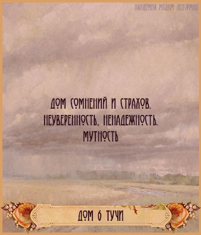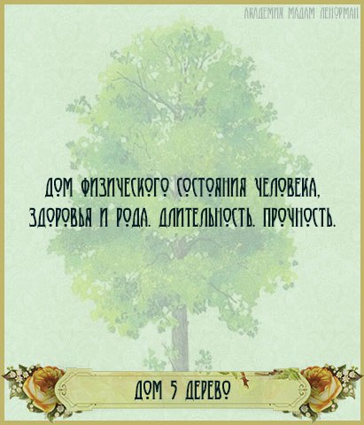 Также 4 дом всяких интимных вещей, то что скрыто за шторами спальни, каков человек в душе, когда остается сам дома без взглядов посторонних.5 — Дом Дерева в Большом раскладе Ленорман:Дом здоровья, физического состояния человека и рода. Дом Дерева в Большом раскладе ЛенорманДом Дерева – дом здоровья, стабильности, прочности, стойкости, длительность, роста, долгосрочных проектов. Дом Дерева показывает физическое состояние Кверента: склонность к заболеваниям, способность организма к восстановлению, адаптация к меняющимся условиям жизни. В целом Дом Дерева – это: Здоровье. Род. СтойкостьВ 5 Доме – корни человека, как по роду, так и в более широком смысле – отношений, проблем. В этом доме вопросы, затрагивающие всех членов семьи.6 — Дом Тучи в Большом раскладе Ленорман:Дом сомнений и страхов. Дом Тучи в Большом раскладе Ленорман6 Дом Тучи – дом неясностей, замешательства, ненадежности, изменчивости, страха и неуверенности (для которой есть почва), дом изменений со знаком «минус».Дом Туч показывает зарождение тревожных событий, но если в этом доме выпала Фигура (Мужчина, Женщина, Медведь, Змея, Собака), то это может быть указанием на возвращение человека из прошлого. Карте Тучи в Большом Раскладе Ленорман всегда уделяют особое внимание, так и дому этой карты тоже стоит уделить внимание, он показывает затемнённую сторону жизни, страхи и сомнения.6 Дом показывает разочарование, расстройство, горести и слезы. Также в доме Туч лежат события, которых человек не понимает, и поэтому старается закрыть на них глаза, боится и избегает.Также к этому дому относятся такие явления как непознанное и мистика.7 — Дом Змеи в Большом раскладе Ленорман:Дом обмана, коварства. Мистики. Дом Змеи в Большом раскладе ЛенорманДом Змеи – это дом злых намерений, коварства, предательства, подлости, неприятностей, осложнений, обходов и окольных путей, измен и секса. Все, что является злом для Кверента, то попадет в 7 дом. Очень часто сама карта Змея указывает на соперницу, потому при соответствующих вопросах стоит уделить внимания и ее дому. По карте Змея – это либо мудрая, либо вероломная женщина, которая делает так, как ей удобно несмотря ни на что. Поскольку карта Змея – символ медицины и мудрости, то дом также может указывать на область оккультных наук, знаний, эзотерику. Может указывать, что сам Кверент занимается магическими практиками, или на него были сделаны наговоры, порчи и т.п. также к 7 Дому относится и изготовление зелий, смесей, ядов, алхимии, химии и медицины.В раскладе для:- Мужчины – вопросы, связанные с сексом и потенцией.